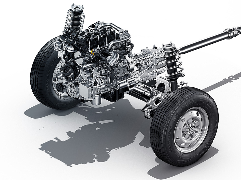 Vybaveno zadními polyuretanovými tlumiči s proměnnou tuhostí pro lepší plynulost manévrování. Listové pružiny z vysokopevnostní oceli s dvoudílnou konstrukcí s proměnným průřezem pro zvýšenou nosnost a plynulost manévrování.